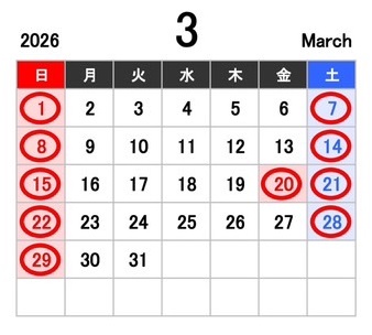 3月の弊社営業カレンダーは下記の通りとなります。(赤丸:休業日)