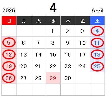 4月の弊社営業カレンダーは下記の通りとなります。(赤丸:休業日)